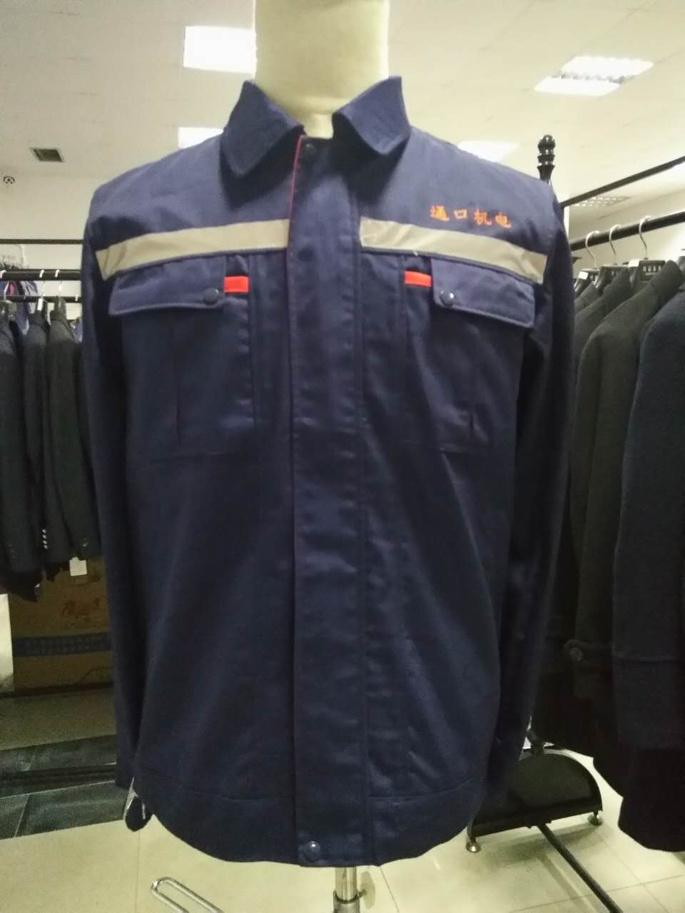 此款就是通口机电选择的工作服男装, 还是和去年的工作服的要求一样,在前后加上2.5公分的反光条,左胸刺绣上橙色的LOGO,老客户,要求熟记于心。