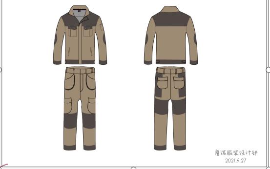 此款设计是咖色和咸菜色相搭配,衣服多立体口袋,在膝盖和屁股处都有加固设计。