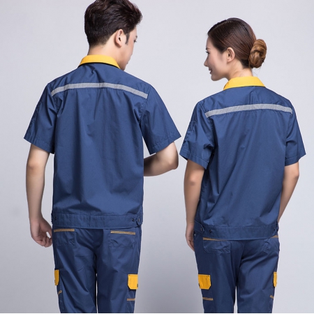苏州鹰诺服装:深蓝配桔红短袖工作服AD069