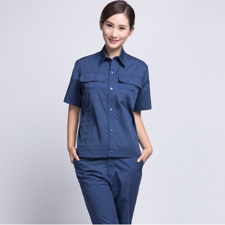 苏州鹰诺服装:深蓝配桔红短袖工作服AD069