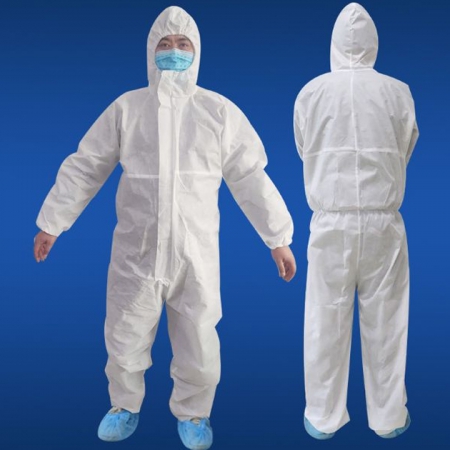 企业隔离衣样式:连体带帽,帽子,手口,脚口加松紧增强密封性,拉链门襟方便穿脱;