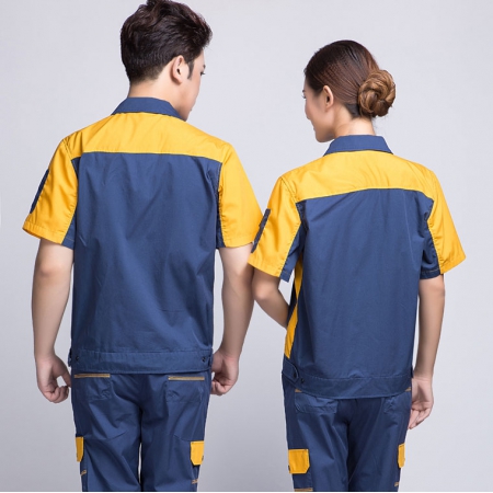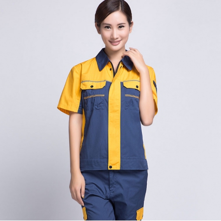 苏州鹰诺服装:深蓝配桔红短袖工作服AD069